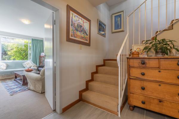 Upstairs, you will find two generously sized bedrooms. The main bedroom boasts an ensuite bathroom, built-in cupboards. The second bedroom also features built-in cupboards and has access to a separate bathroom. Both bedrooms lead out onto a sun-filled balcony overlooking the gardens.