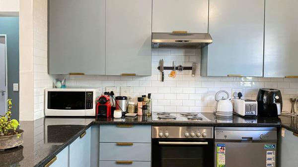 The designer kitchen is a standout feature: reimagined with stylish grey cabinetry, sleek black granite countertops, a breakfast bar, and space for three under-counter appliances. Cook in style with a built-in hob, oven, and extractor fan.