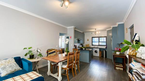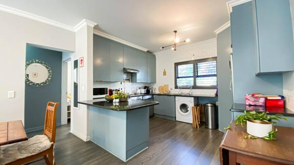Step into a sun-drenched, north-facing home with expansive open-plan living and dining areas, framed by elegant arched windows and doors. The seamless flow leads out to a covered patio with drop-down blinds, offering serene views of the beautifully maintained communal garden perfect for morning coffees or entertaining.