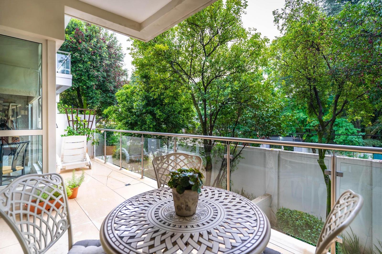 The kitchen has a gas hob and Caesarstone counter tops. The living room opens out through ceiling-high sliding doors to a good-sized patio with an aluminium and glass balustrade, with a lovely tree outlook.