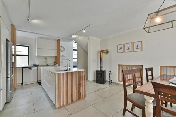 Recently upgraded with Smeg appliances, stone countertops, and a cozy fireplace heat stove, all flowing into open-plan dining and lounge areas.
