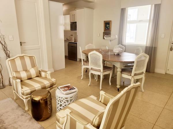 Incredible 24 hour security and guarding Generator in the building fully powering all apartments Bright and Spacious open plan dining lounge and kitchen living space with modern glass framed windows and sliding door White screed flooring Fully curtained and fully furnished Fully equipped spacious Caesar stone kitchen with breakfast counter including all kitchenware and appliances as well washing machine and dishwasher Magnificent solid oak cabinet with shelves Modern Gas fireplace Economical gas line Spacious tiled patio with glass balcony surround Main bedroom with separate built in cupboard dressing room Spacious Main bathroom en suite Second bedroom with built in cupboards and en suite bathroom Both with bath and shower