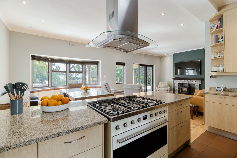 High ceilings, bay windows, and wood floors. The open-plan dining and family room, complemented by a wood-burning fireplace, seamlessly flow into the contemporary fitted granite kitchen featuring a Smeg stove and extractor fan. A cosy Pyjama/TV lounge adds a touch of comfort, while the three double bedrooms, all en-suite, offer ample space. The main bedroom, facing North, even includes an outdoor shower. Two additional bedrooms with en-suite shower rooms provide extra convenience, accompanied by generous built-in cupboards. Glass doors open from every bedroom to the beauty of the garden.