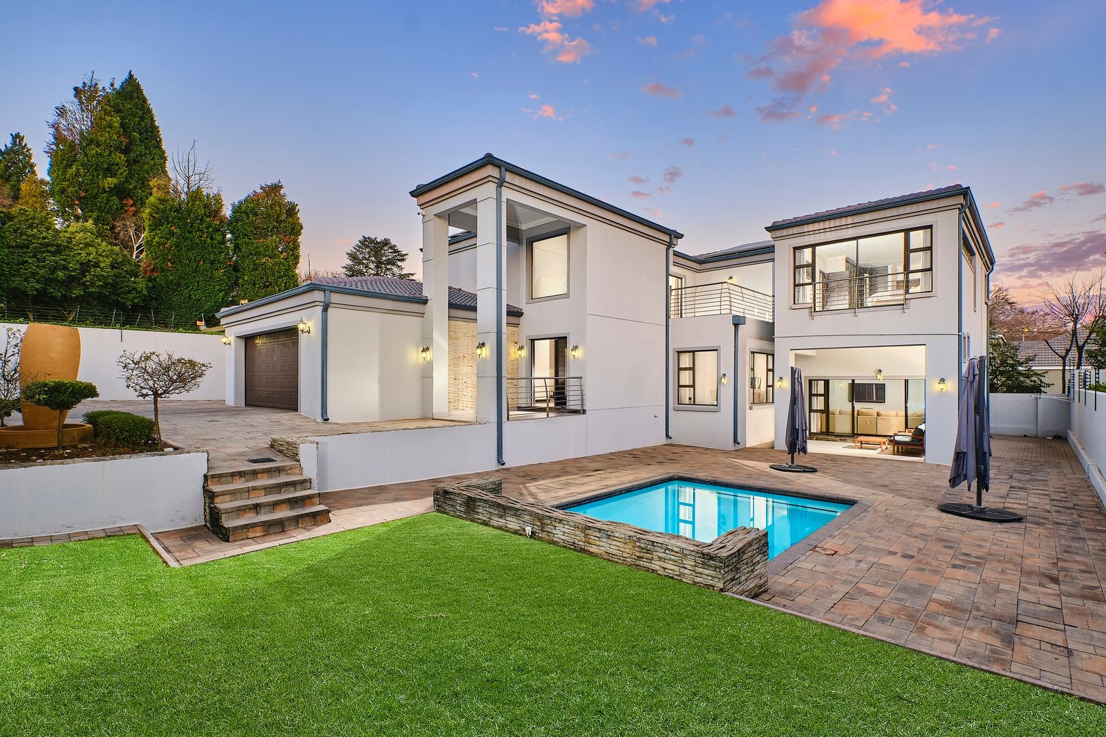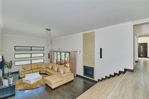 The designer playroom, guest cloakroom, and supreme dining area are all thoughtfully positioned for practical family living. The upmarket eat-in kitchen features Caesarstone counter tops, premium finishes, gas hobs, and a separate scullery.