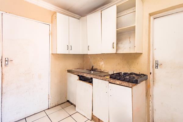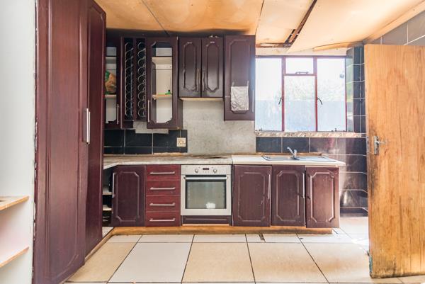 Kitchen: A spacious kitchen fitted with built in cupboards and a stove needs TLC