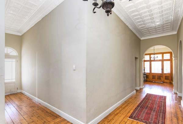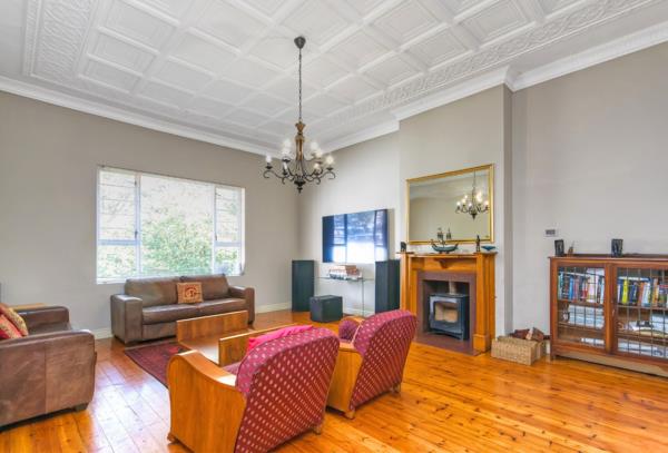 The house retains period character through great proportions, high pressed steel ceilings, wood floors, and bay windows, complemented by tasteful feature light fittings. A wood-burning fireplace anchors the lounge, while two inter-leading reception rooms offer flexibility for entertaining or day-to-day living.