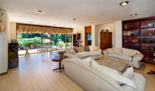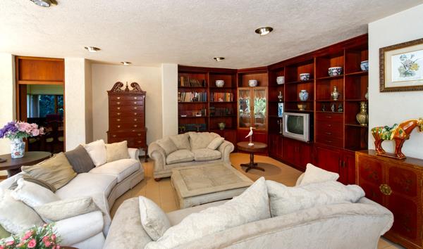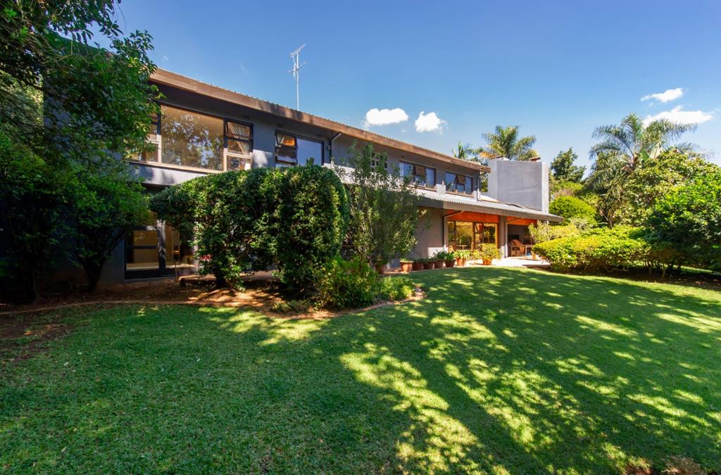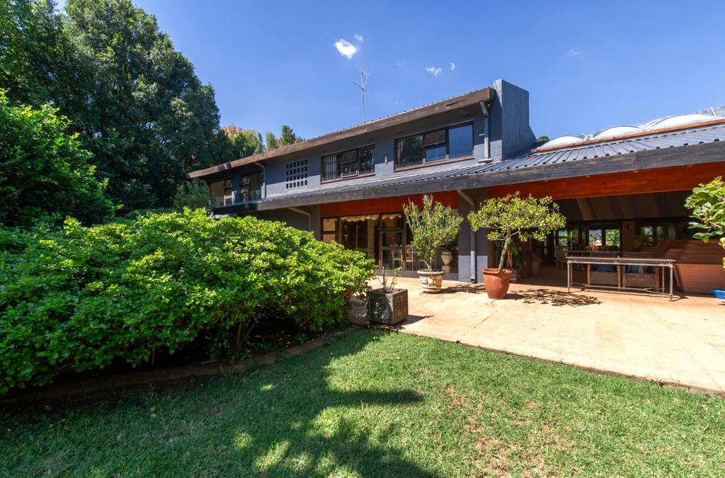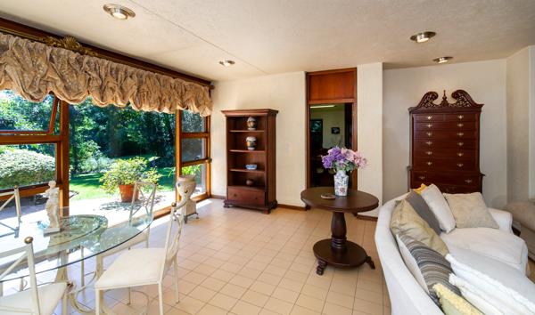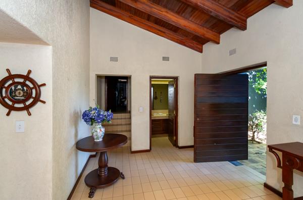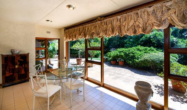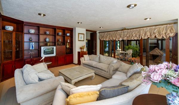 Luxurious Living Areas: The unique dining room flows into an oversized gourmet kitchen with a casual dining area, a walk-in pantry, and a separate scullery and laundry. The TV lounge with wood flooring equipped with a cozy fireplace, is adjacent to the guest bathroom. Two reception areas open onto a covered atrium, which connects to a large patio with a built-in braai, overlooking a beautifully landscaped garden and a fully fenced wrap-around pool.