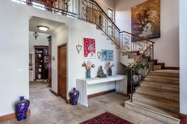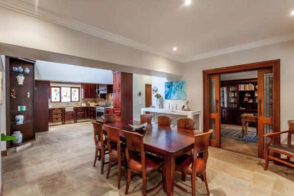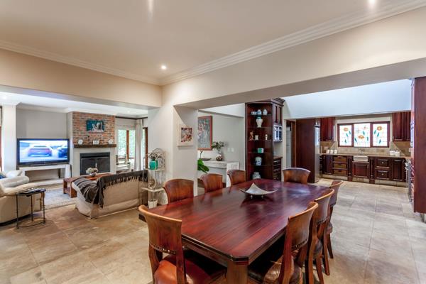 This unique home features an inviting double volume entrance hall leading to open plan lounge, a spacious dining room, and a dedicated private study with built-in cabinets ensuring plenty of room for both leisure and productivity. The lounge boasts a wood burning fireplace. The versatile layout includes an open plan fully equipped kitchen with gas stove, and separate scullery.
