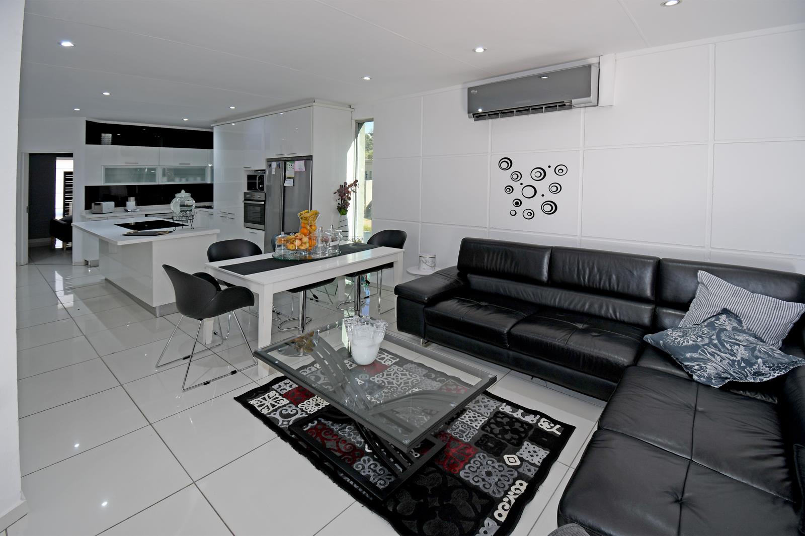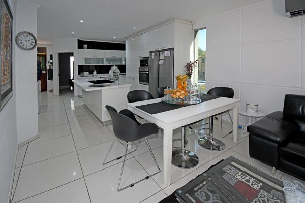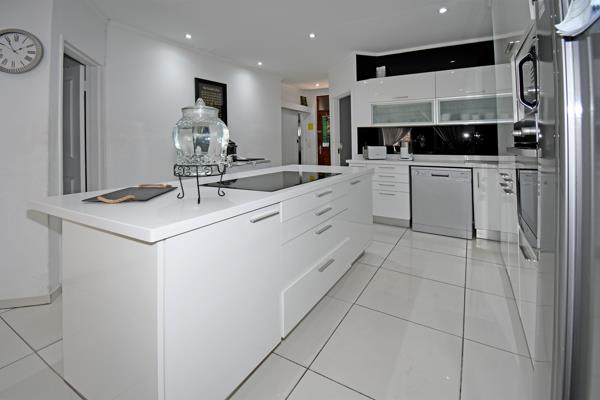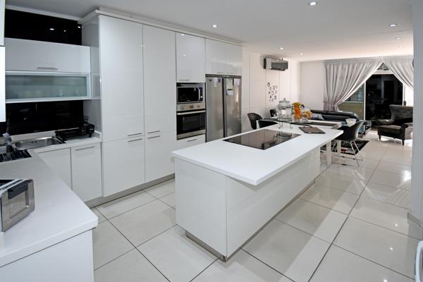 Kitchen : The contemporary open-plan kitchen is outfitted with a centre island and quality appliances.