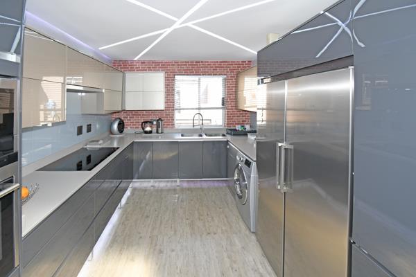 Modern open plan kitchen with high glossy cabinetry, granite countertops and a hob. Space for appliances and double door fridgefreezer. Opportunity for a second kitchen includes a gas stove, study or an entertainment area for the kids - your call.