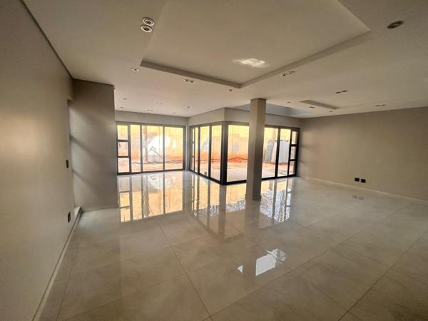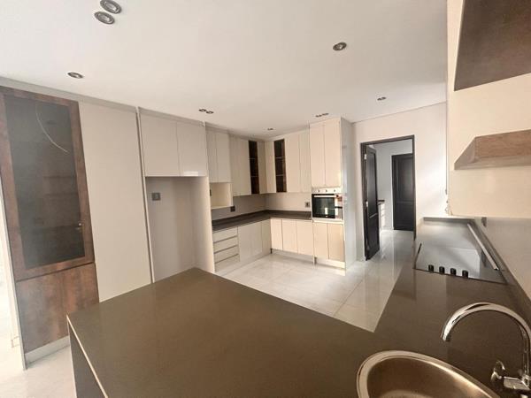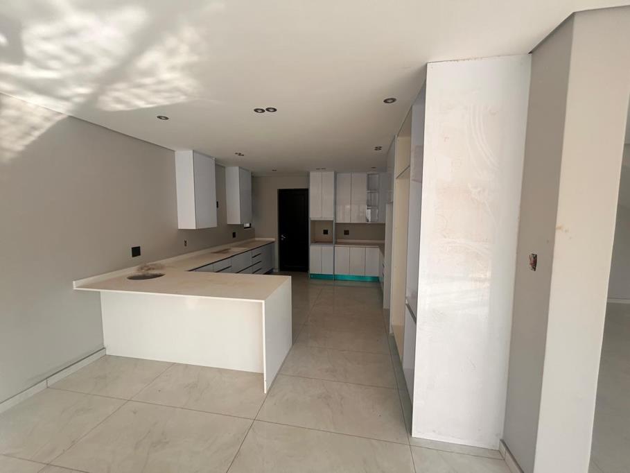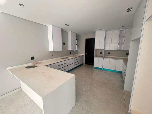 The home features four spacious and elegantly designed bedrooms, each with beautifully proportioned wardrobes. All four bedrooms are complemented by luxurious onsuite bathrooms, while a separate guest bathroom ensures added comfort for visitors. The master suite, built on an impressive scale, includes a generous walk-in closet, a private balcony and a refined ambiance befitting its status. Three of the bedrooms are located upstairs, while one is situated on the ground floor, offering flexibility for family and guests. The living spaces are open plan and bathed in natural light, creating a seamless flow throughout the home. An exceptional gourmet kitchen, complete with an adjacent dining area and scullery, forms the heart of the residence. Designed for both entertaining and everyday living, it is a true culinary haven. Additional features include a dedicated home office and staff accommodation, ensuring that all modern living requirements are met.