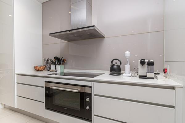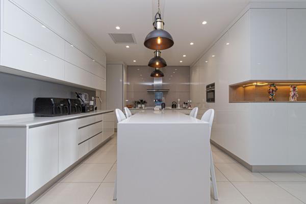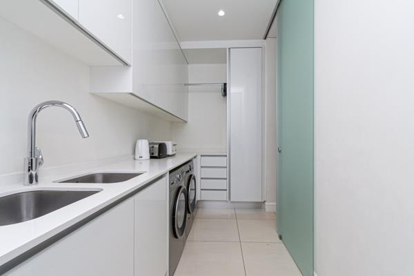 The beautifully appointed open-plan kitchen is a culinary dream, featuring modern finishes, a built-in microwave, a built-in double door fridge and freezer, an under-counter drinks fridge, and a separate scullery to keep the space pristine.