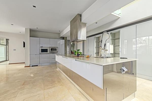 Modern gourmet kitchen, spacious with centre island, nook lots of built in cupboards, integrated fridge and freezer Gaggenau appliances, with tiled finishes, gas stove, cooker hood, oven, scullery with 2 plate gas stove, plumbed for 4 appliances and a huge study.
