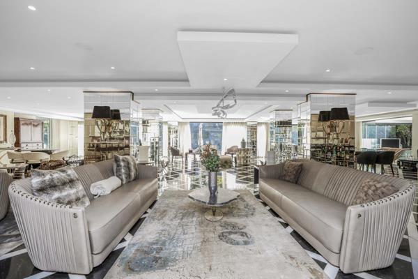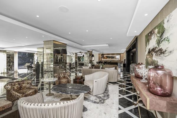 There is a rose gold and marble designer kitchen created by Visionnaire and imported from Italy. Fully equipped with Gaggenau appliances, three ovens, a gas hob, two pantries, a walk-in cold room, a walk-in freezer, a scullery, and a marble centre island, this is a culinary space made for grand entertaining. A breakfast alcove connects to an additional lounge and dining area, while a unique glass-enclosed plunge pool begins upstairs and pours its way down a striking architectural element visible from both levels.