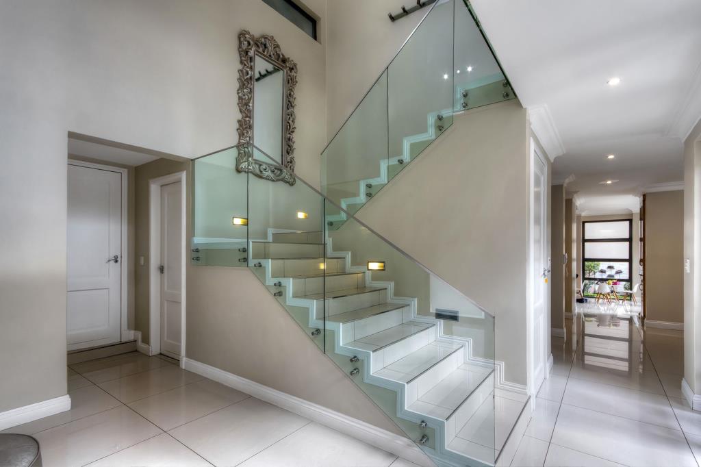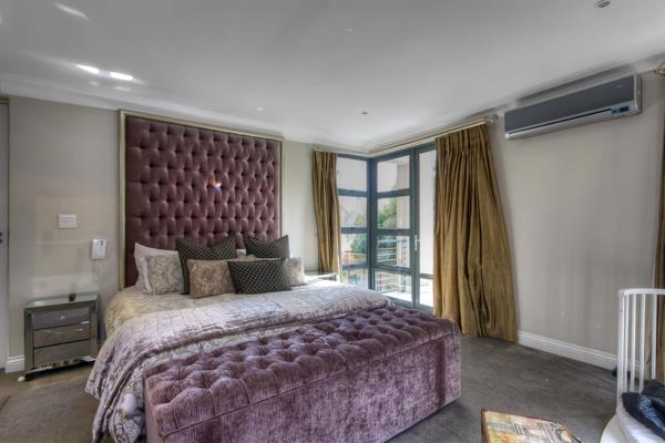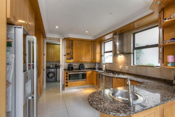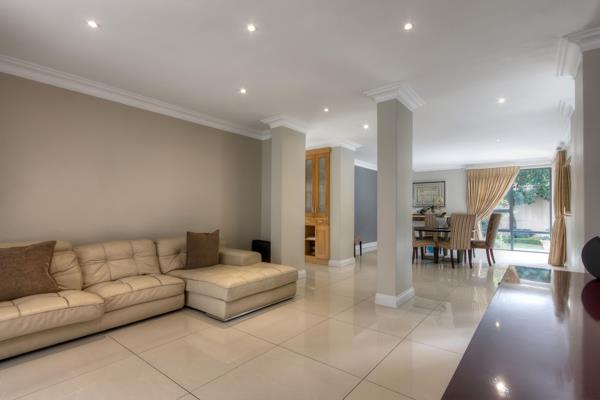 Double-volume patio overlooking the pool and garden, double garage, and staff accommodation.