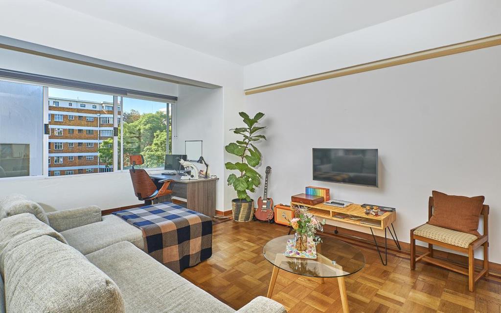 Situated in a quiet and tranquil corner of an Art-Deco building, this unit overlooks a private garden at the back, with views of the Jacarandas from the lounge.