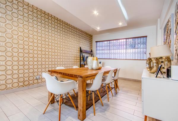 The dining room flows into a modern kitchen plumbed for 4 appliances, nook, blinds, piped gas, stove, oven, cooker hood, Ceasar surface, double basin, tiled floor, laundry, domestic room, and 2 undercover parking.