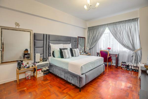 A separate, versatile room offers the flexibility of a family room, study, or guest bedroom, complemented by a stunning chandelier. The three spacious bedrooms are serviced by two bathrooms: the main bedroom boasts an en-suite, while a second well-appointed bathroom serves the rest of the apartment. A fabulous linen cupboard in the passage to the bathroom provides ample storage, adding practicality to the home. An elegant chandelier adorns the lounge and dining areas, enhancing the sophisticated ambiance.