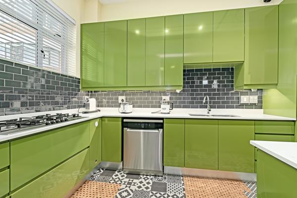 Open plan kitchen with Caesar surface top, gas hob and extractor fan, fridge, extra lighting, dish washer, white fittings, oven, and breakfast nook , centre island, with bar stools, lots of added lighting, storage space