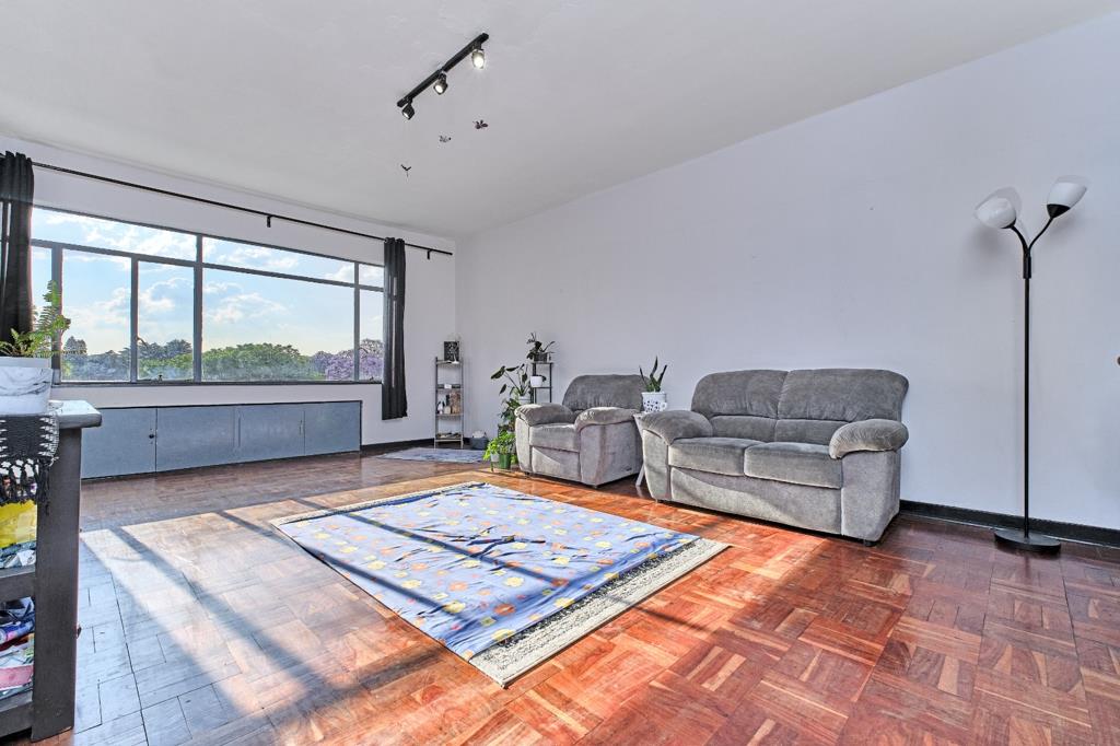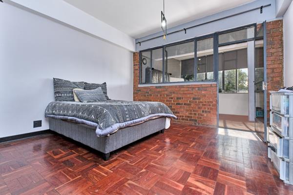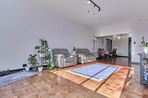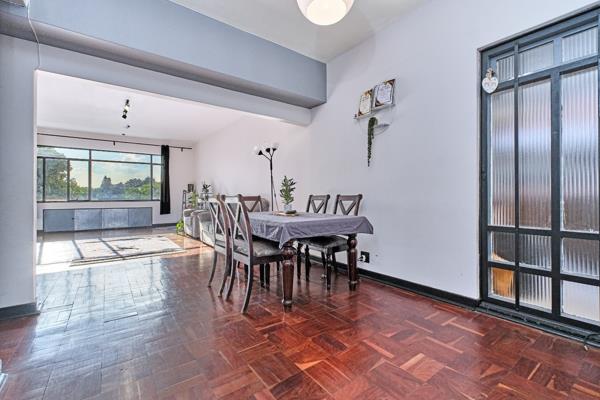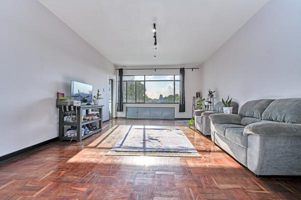 Discover this spacious 96 sqm apartment located in a secure complex in the vibrant Killarney suburb of Johannesburg. The interior boasts a generous open-plan living and dining area, characterized by classic parquet flooring that offers both character and the potential for modern refurbishment. Large windows throughout the living spaces invite abundant natural light, creating a bright and airy atmosphere, complemented by neutral white walls ready for your personal touch. The layout includes one well-proportioned bedroom and the convenience of two bathrooms, providing ample comfort and functionality for residents.