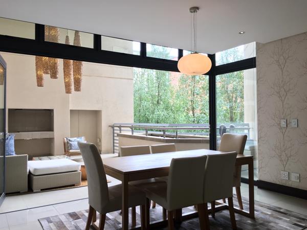 The indoor and outdoor living flow seamlessly, with the substantial double volume terrace with built in braai overlooking the manicured gardens of the complex.
