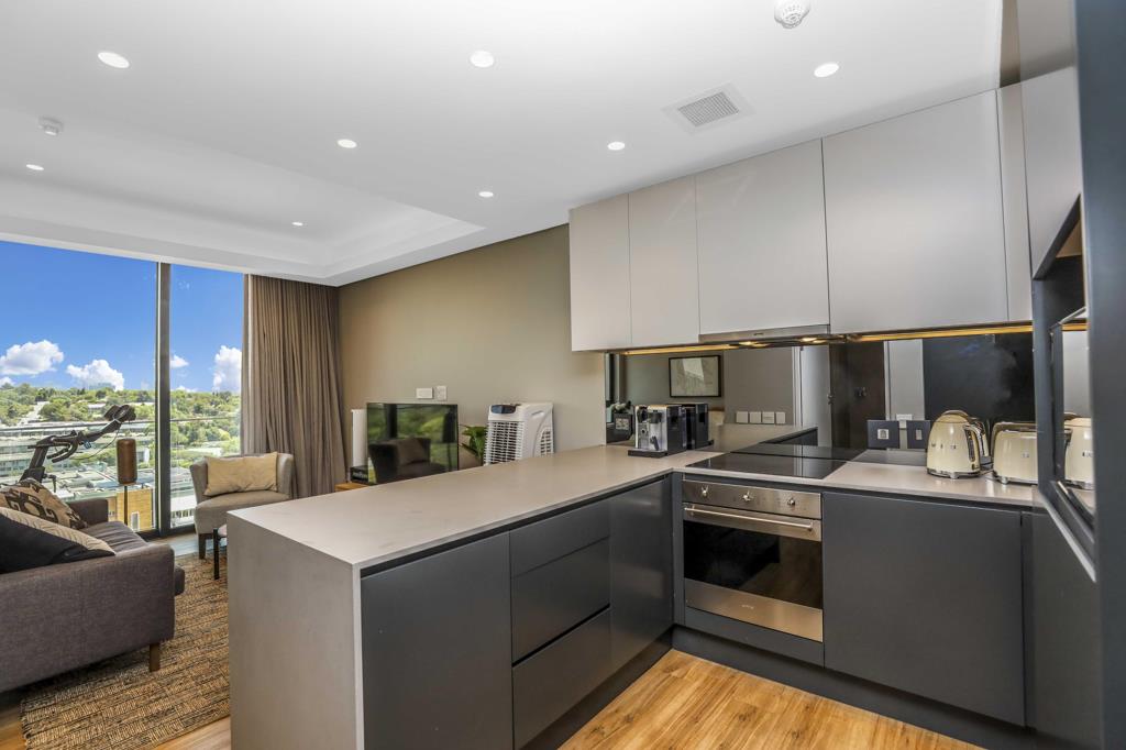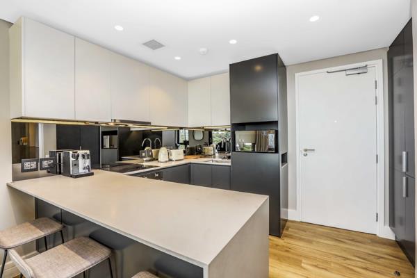 Gorgeous, super stylish, North facing, private and secure. This is the perfect lock up and go for the travelling executive. Say goodbye to hotel stays and invest in magical Melrose Arch. This designer studio apartment has a chic kitchen complimented by the fully integrated appliances which include a Smeg fridge/freezer and a Bosch dishwasher. Clean lines and smokey mirror splashbacks enhance the appeal of the kitchen. It offers a host of cupboard and counter space, and the large counter area is ideal for stools allowing it to double up as a work and eat in space. The living area has large sliding doors to enjoy the amazing views. The bedroom area can accommodate a king-sized bed and offers 6 built in cupboards. The bathroom has a rain shower and is well designed offering extra cupboard space for towels and toiletries. The unit has secure basement parking and full generator back up as well as 24-hour concierge/security. On-site cleaning service available. The perfect move in and enjoy opportunity.