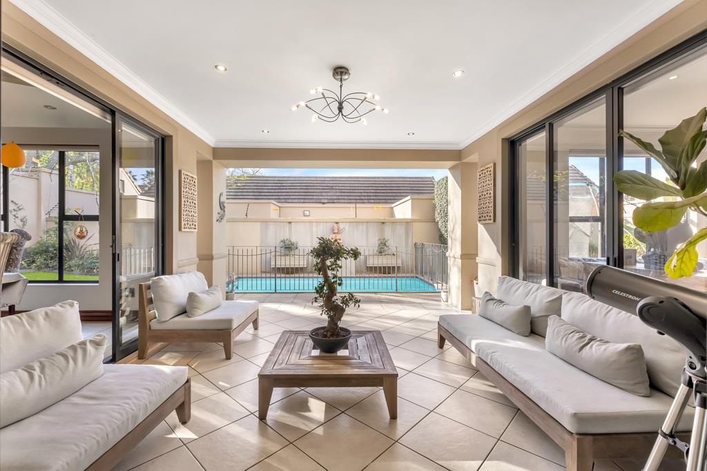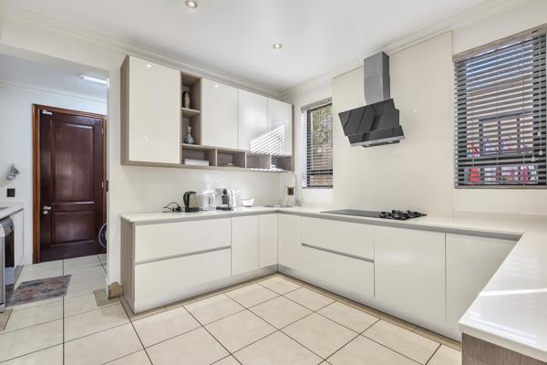 A thoughtfully designed double-volume entrance hall welcomes you, creating an airy sense of space and light that flows seamlessly throughout the home. Stacking aluminium doors open onto the patio, manicured garden, and heated pool, perfectly integrating indoor and outdoor living. The refurbished kitchen with separate scullery and laundry complements the elegant open-plan reception areas, ideal for modern family living and entertaining.