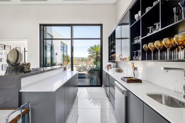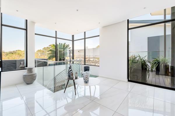 A sculptural glass spiral staircase ascends to the upper floor an expansive entertainment level with a 2nd lounge, dining space, fitted bar, built-in gas braai, guest toilet and secondary kitchenette. The rooftop terrace stretches out to panoramic views across Johannesburg, framed by glass, air, and sky. A third en-suite bedroom provides serene seclusion for guests.