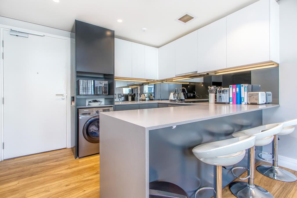 The open-plan layout unfolds into a welcoming reception area and a sleek, contemporary kitchen fitted with premium SMEG appliances, a mix of white and grey cabinetry, glass splash backs, and fully integrated appliances for a streamlined, minimalist look.