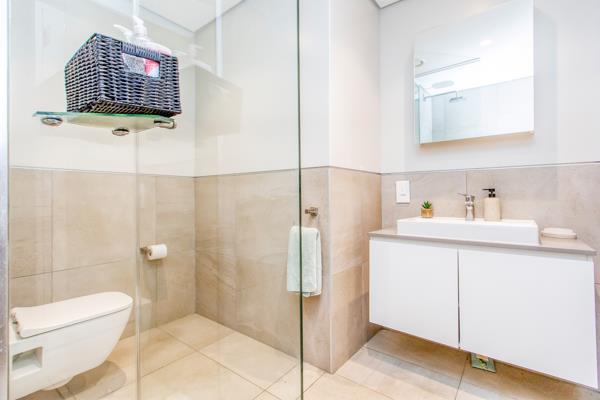The cleverly designed bedroom zone features a walk-in dresser leading into a chic bathroom with a modern shower, vanity and toilet, all finished to perfection.