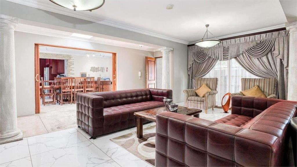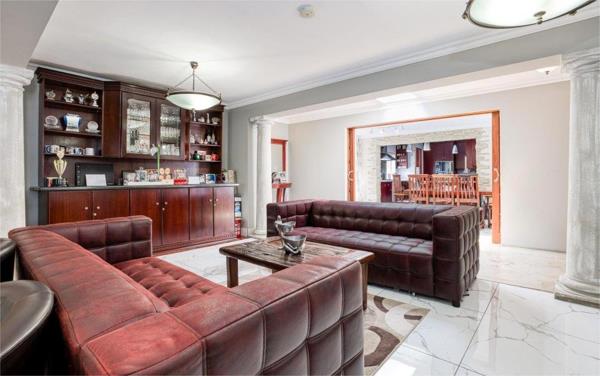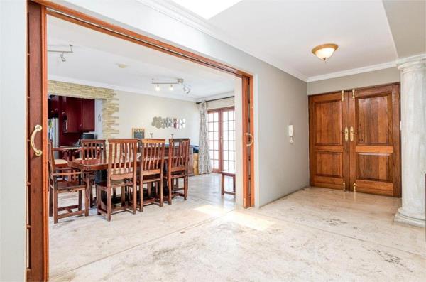 The open-plan layout creates a seamless connection between the kitchen, dining, and two lounge areasperfect for relaxed family living or effortless entertaining. Wooden doors open onto a large covered patio with a built in braai, overlooking the sparkling swimming pool, providing the ultimate setting for alfresco dining, weekend braais, or simply unwinding in the sun with loved ones.
