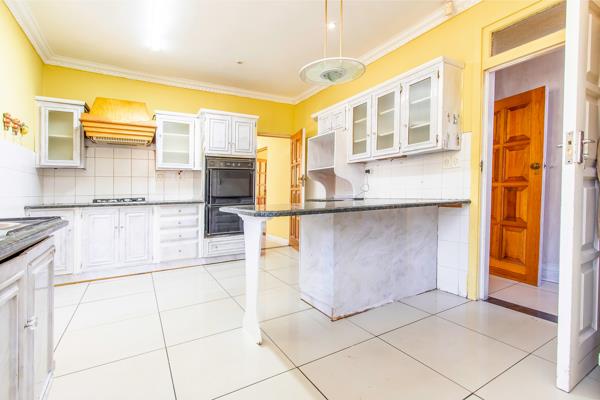 The kitchen boasts marble tops and plenty of cupboard space, a gas stove, double oven, and a separate scullery laundry.