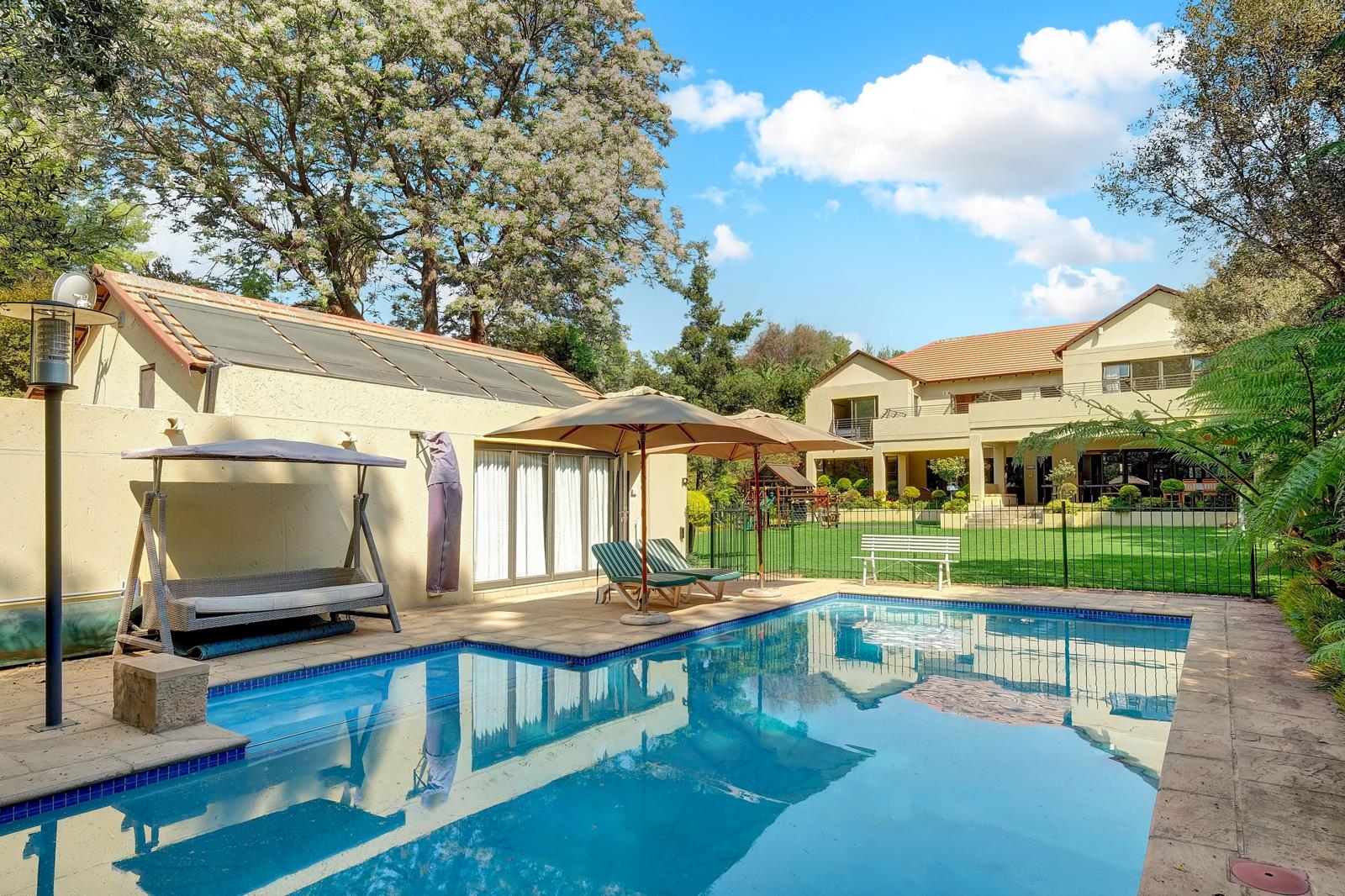 The living areas are spacious and cater to every need, including an open-plan lounge & dining room, a large, well-appointed kitchen, two work-from-home offices, a playroom, a fully-equipped gym (40m2) overlooking the pool, and a large patio with gas braai. Ideal for easy living and easy entertaining.