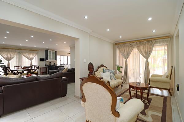 The main house features three well-sized bedrooms plus a 4th bedroom or study and two full bathrooms each fitted with a bath and a shower. The entrance hall leads into the generous living areas, including a large open-plan lounge, dining area with a gas fireplace, separate familyT.V. room and a bright modern kitchen equipped with an electric oven and hob. The home is tiled throughout, enhancing its spacious, clean contemporary feel. The rooms are bright with several doors opening to outside areas and patios.