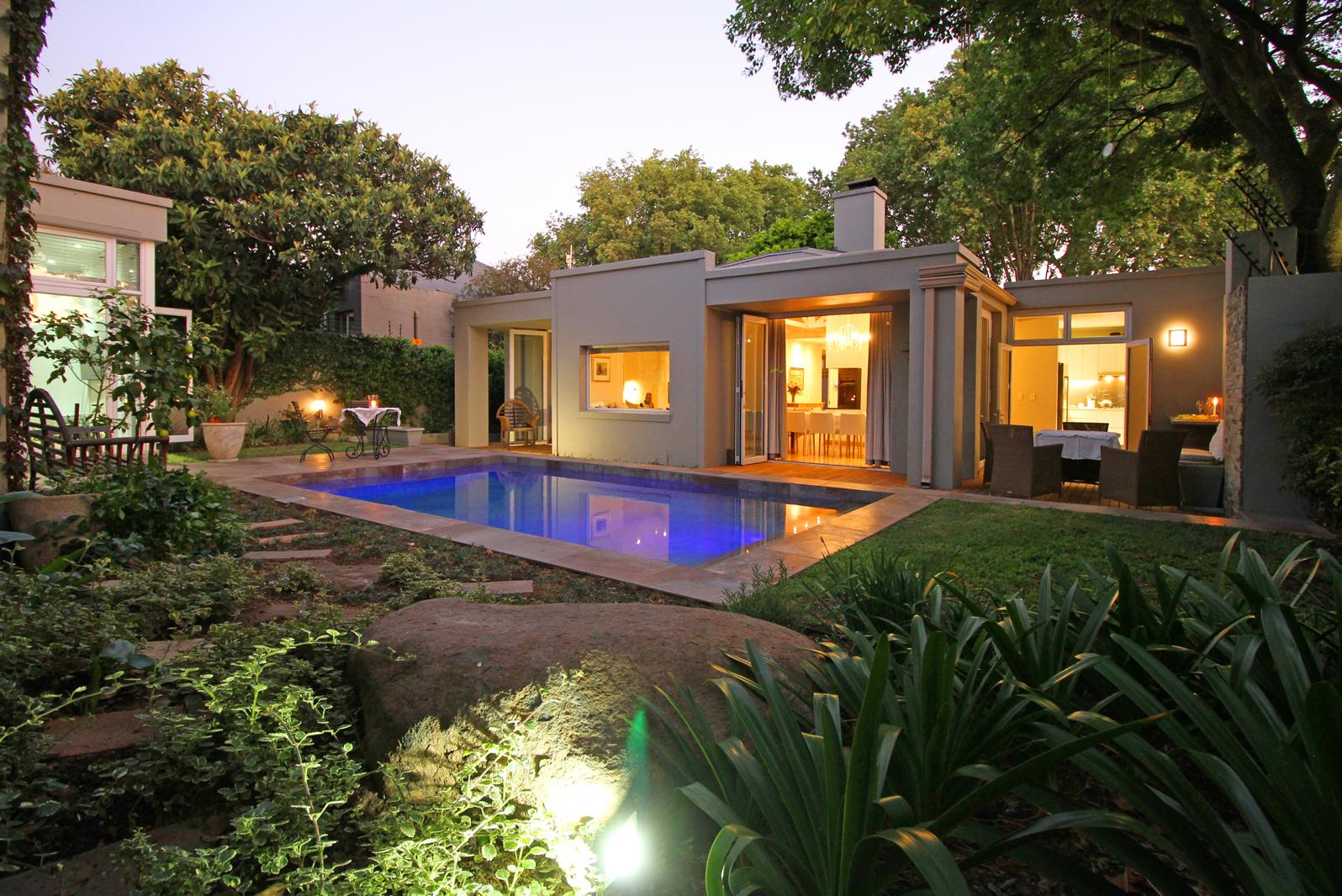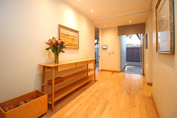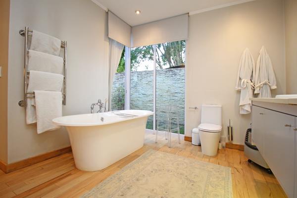The main bedroom suite is a peaceful retreat also with Cherrywood floors, built-in cupboards, fitted blinds, air conditioning and a spacious en-suite bathroom with heated towel rails and doors opening out to a private tranquil garden with an outdoor shower and modern water feature. The second en-suite bedroom is equally well appointed, with the same beautiful finishes and attention to detail.
