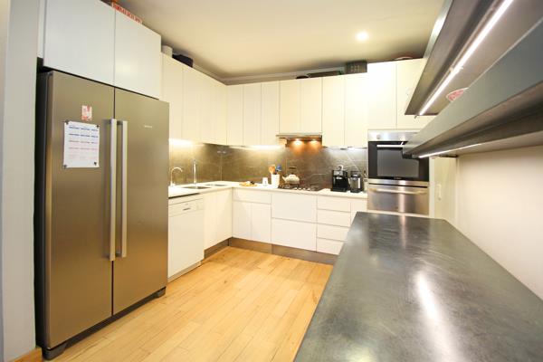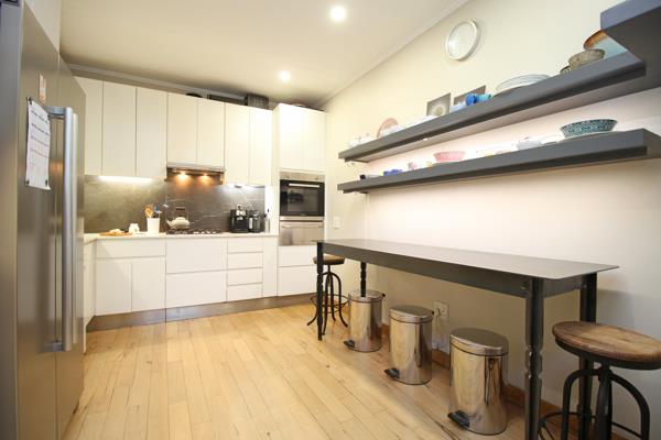 The kitchen includes a custom made 2 m Gregor Jenkin metal table, gas hob and oven with electric grill and large sliding doors that also open out to the garden. A light-filled office just off the lounge area includes a window seat and tasteful cabinetry, ideal for working from home.