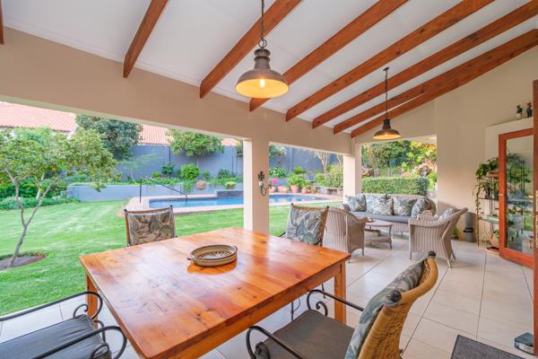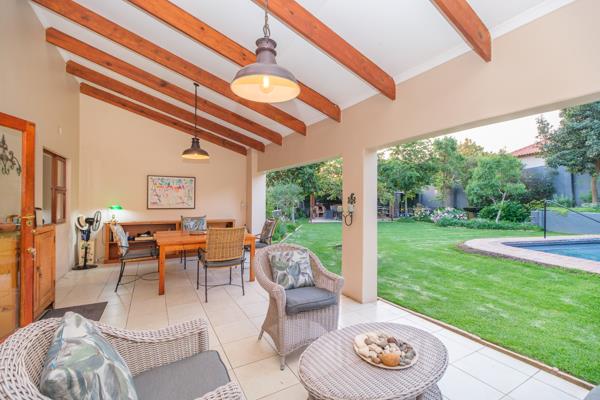 The outdoor entertaining area is an entertainers dream. A covered patio with space for both dining and lounging overlooks the inviting swimming pool and manicured grounds. The braai area is elegantly designed, complete with all the luxuries that make outdoor dining feel truly decadent.