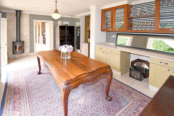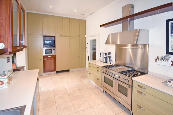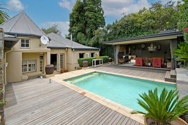 Complete with two-tone cabinetry, the heart of the home is the modern Chefs kitchen with Caesarstone countertops and an Ilve gas stove with extractor. Flowing from the kitchen is an inviting dining space with a built-in server and Morso fireplace, leading out to an entertainers dream: a private gazebo with built-in bar, braai and swimming pool surrounded by a wooden deck ideal for hosting in style.