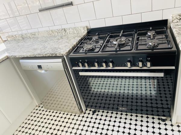 Ultra-modern kitchen with a dishwasher (and washing machine in the unit), double sink, gas stove, light granite counters and USB ports.