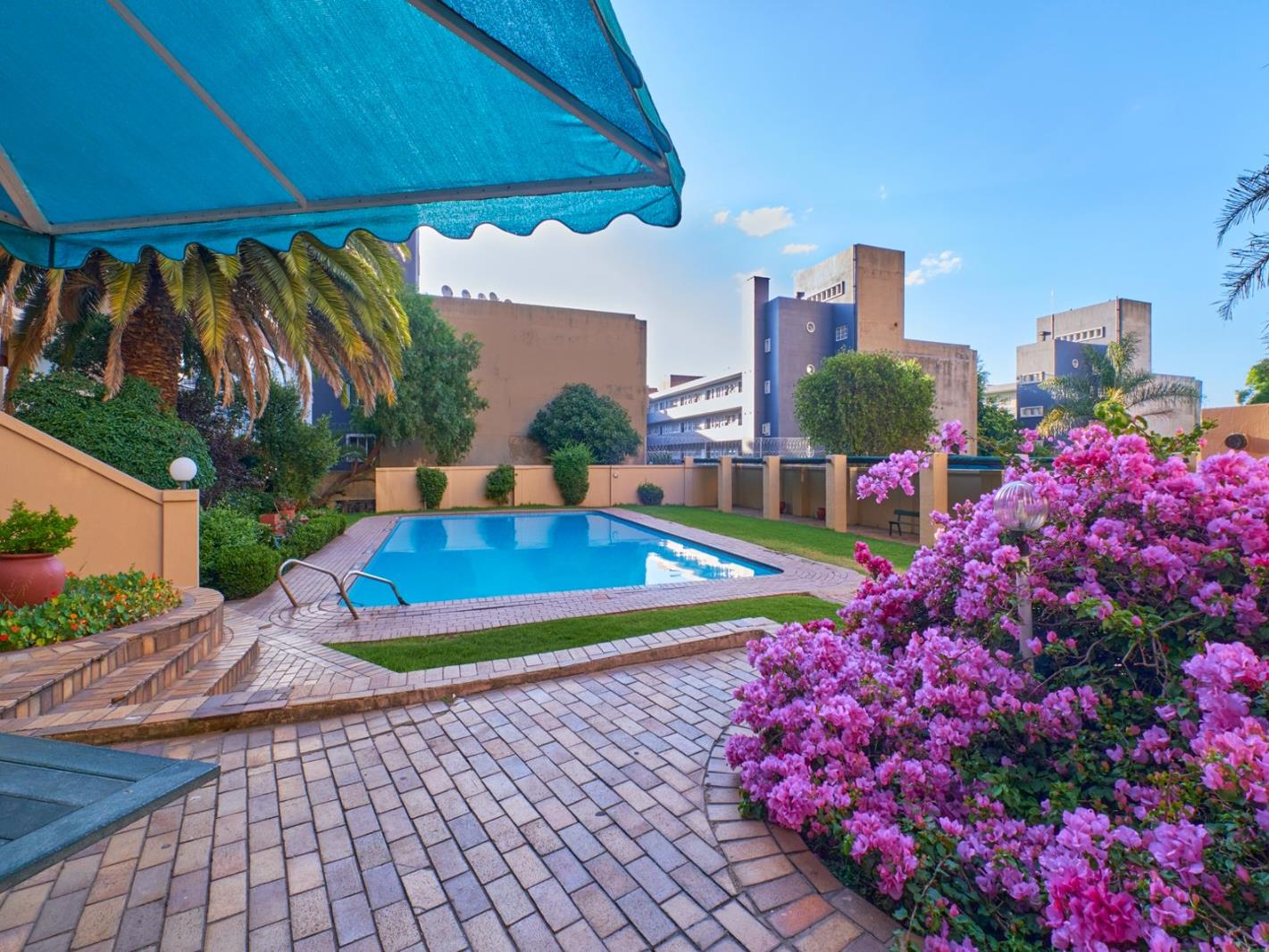 The entire complex has beautifully maintained garden and sparking pool with a six individual stand braai area. Entrance & Exit gates manned 24hrs by a security service. 1 parking.