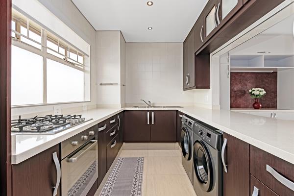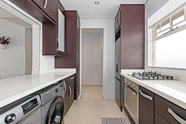 Caesarstone tops, and ambient cabinet lightingideal for modern living. The spacious main suite includes a contemporary bathroom and built-in cupboards, family or a dedicated work-from-home office. Security is prioritized with CCTV and passive LED lighting and electric blinds throughout the unit.
