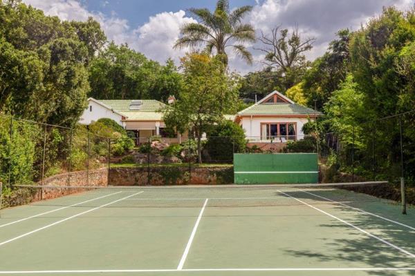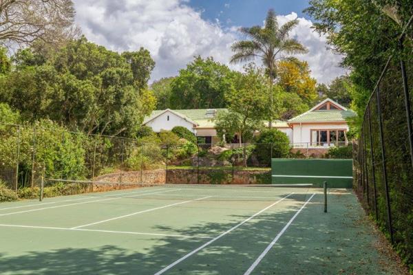 Sparkling pool with surrounding leisure space. Full-size tennis court for family fun or serious practice, water fountain creating a tranquil garden focal point. Established landscaped garden with borehole and automated sprinkler system. Double garage with direct access into the house, double carport plus ample off-street parking. Full staff suite for live-in help.