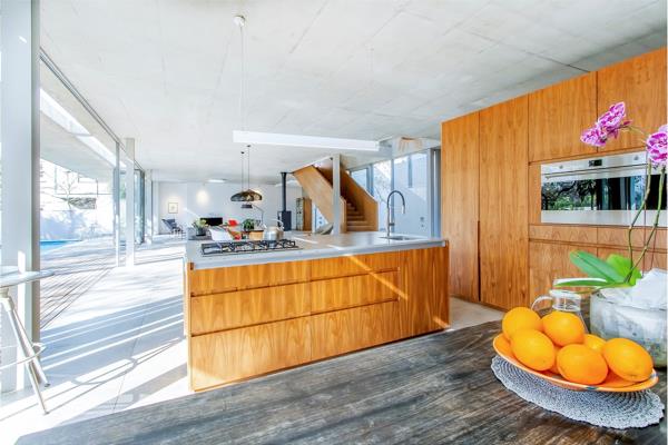 The home is an inspired blend of cutting-edge architecture and natural integration with mature, moss-covered indigenous trees, including Rothmannia Globosa, Mountain Karee, River Bushwillow, Stinkwoods, and a grand Jacaranda, that create a serene canopy that envelops the property. Every space has been designed to honour its natural surroundings, with carefully placed courtyards and expansive, wall-to-wall glazing that flood the interiors with light, frame the lush green views, and blur the line between indoors and out.