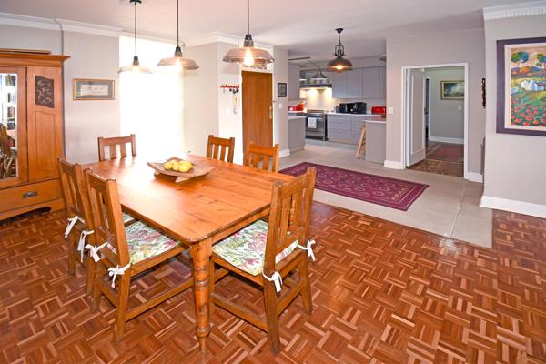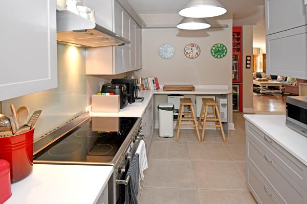 The kitchen has been beautifully crafted with painted cabinetry, stone tops, a large electric cooker, and space for a double refrigerator and dishwasher. An eat-at counter makes catching a quick snack an easy interactive experience. The living room leads to a serene north patio looking onto trees and the pretty garden and pool. Ideal for relaxed entertaining and a family barbeque.