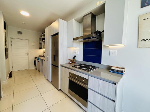 Enter the exquisitely designed, open plan kitchen with SMEG gas hob electric oven, stone counters, large farmhouse kitchen sink, overhead drying rack and space for two under-counter appliances. Segmented bedroom with volumes of cupboard space Glass separates the kitchen and a wall separating the bedroom from the lounge.