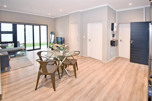 The spacious bedroom features an en-suite bathroom, complete with a modern tiled finish and a walk-in shower. The apartment boasts laminated flooring throughout, giving it a warm and contemporary feel.