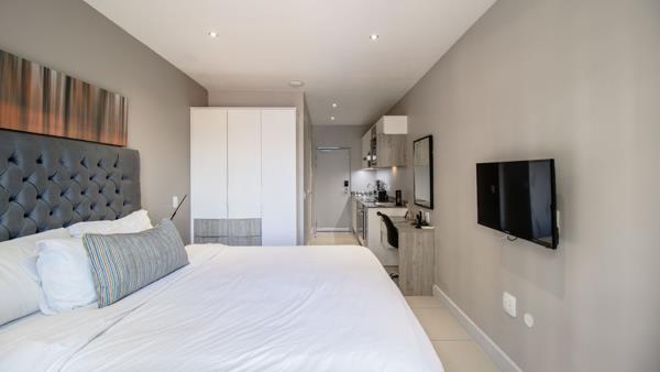 Open-plan studio apartment, perfectly situated in the prestigious The Capital on Bath hotel in Rosebank. Designed for the discerning individual, this luxurious retreat boasts sleek, modern finishes and sophisticated porcelain tiles that elevate the space.
