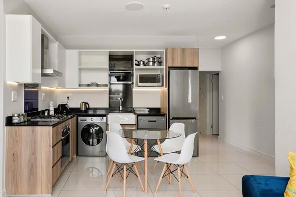 The sleek kitchen features modern appliances and seamless integration with the spacious lounge and dining area. The two bedrooms are beautifully appointed with built-in cupboards, while the main bedroom enjoys its own en-suite bathroom.