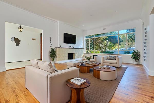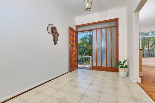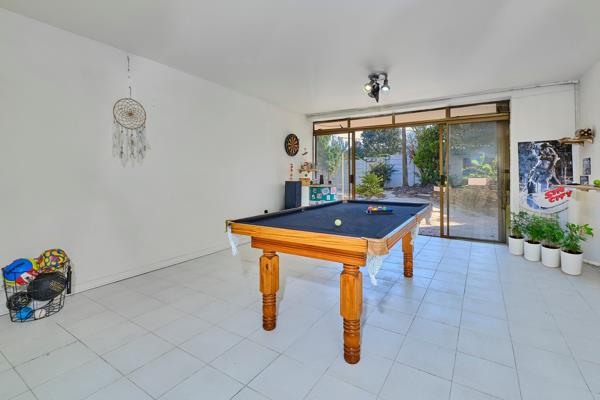 The open-plan entrance hall, lounge, and dining area lead seamlessly to a covered patio. The eat-in kitchen features granite counter tops and a separate scullery. 4 Spacious bedrooms, 2 full bathrooms (main en-suite), and a guest cloakroom. A large entertainment room opens onto an additional patio and sparkling pool, overlooking expansive manicured gardens with ample space for children to play and pets to roam.