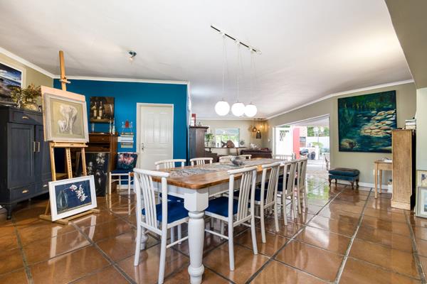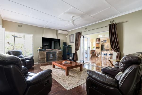 Formal lounge has stacking aluminium sliders flowing out to shade cloth entertainment area, built-in braai and sparkling pool.